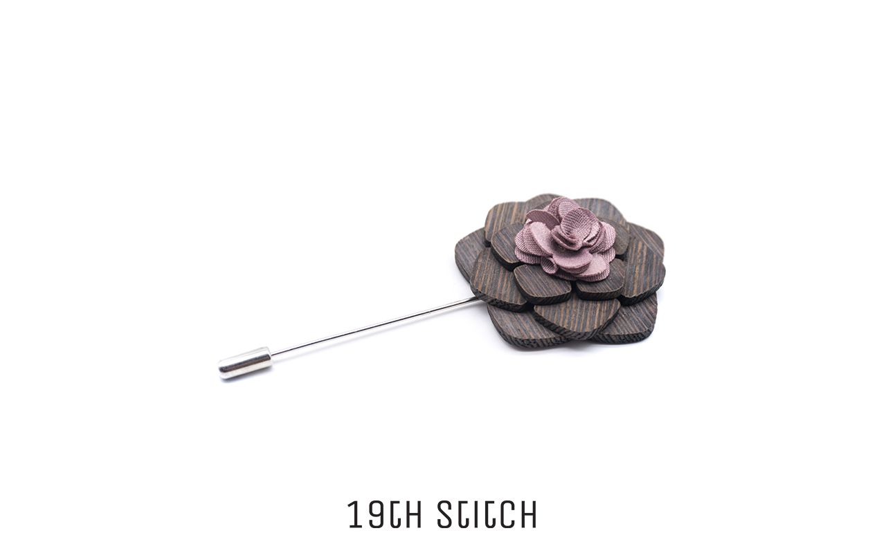 Subtle yet striking, this grey wooden lapel pin with a purple flower design brings a natural yet bold accent to your formal or smart-casual look.