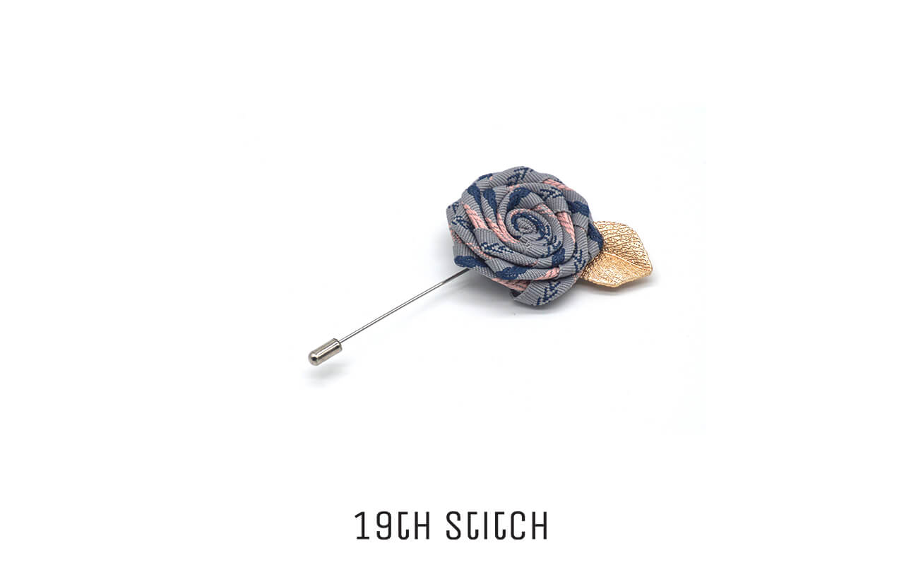 A charming light blue and pink lapel pin with a leaf design, offering a refreshing and nature-inspired touch to your outfit.