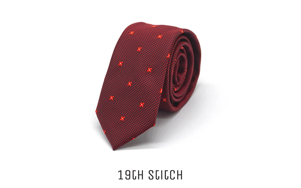 Bold red foulard necktie with tonal red flowers and black line accents—classic with a striking edge.
