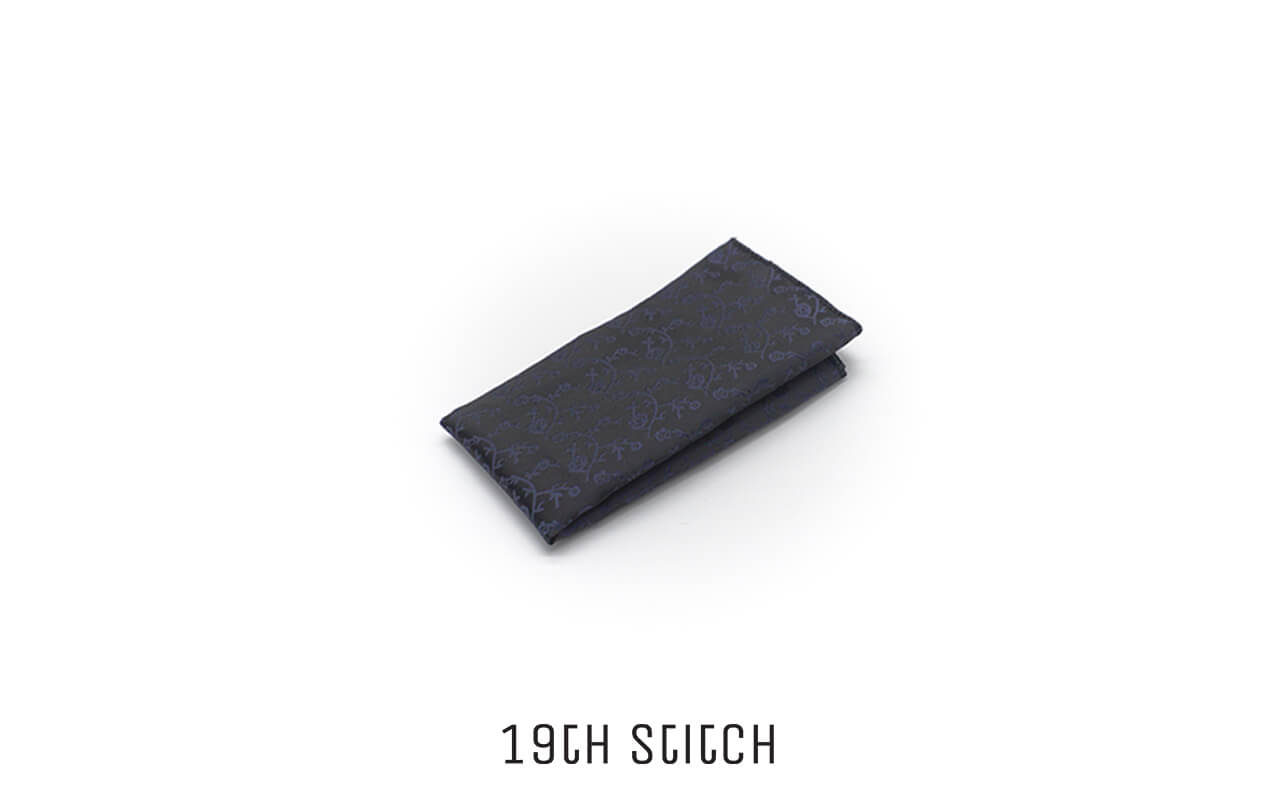 Black pocket square with dark blue floral accents — sleek and refined for formal wear.
