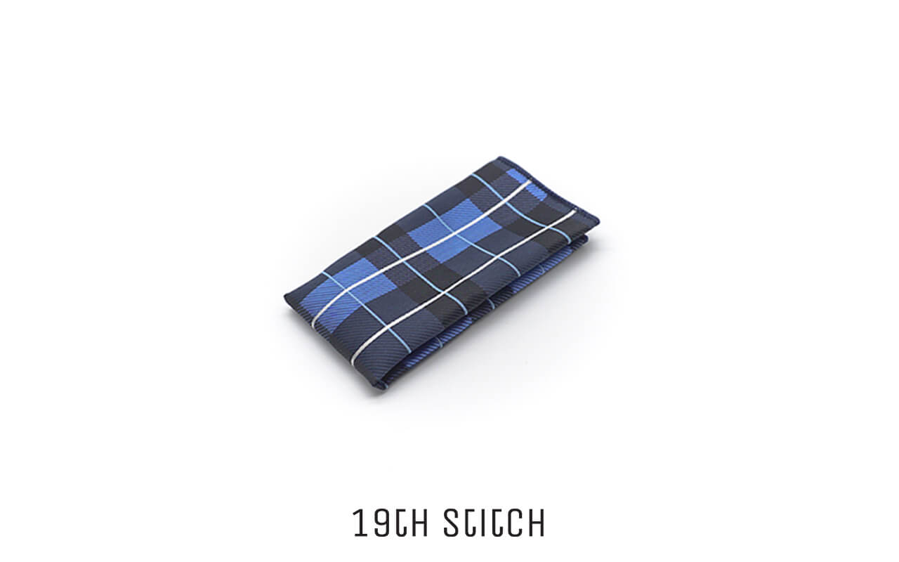 A timeless blue pocket square with clean white plaid lines—balanced, classic, and versatile.