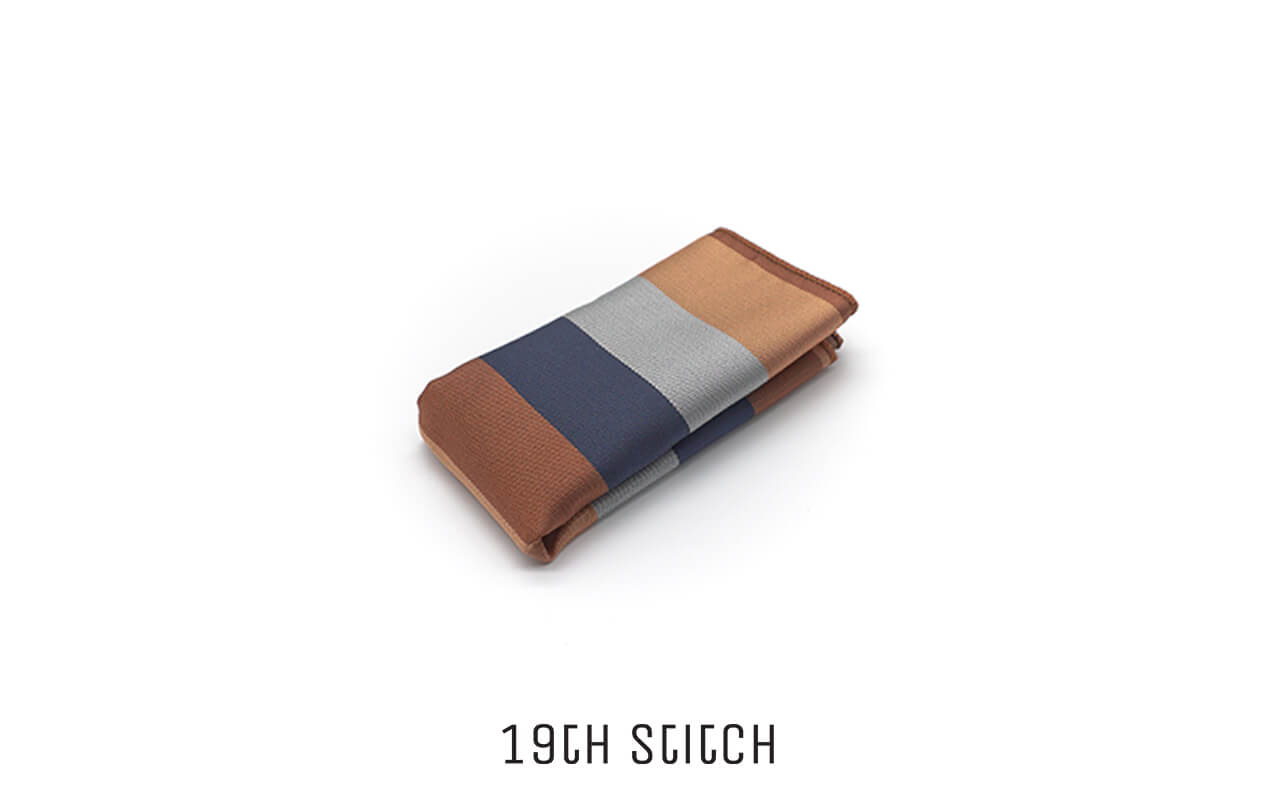 A striking pocket square featuring bold stripes in grey, brown, and blue—modern, earthy, and confident.
