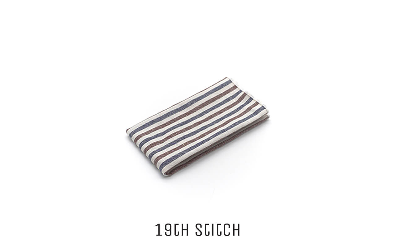 A crisp white pocket square accented with blue and brown lines—subtle, stylish, and highly versatile.